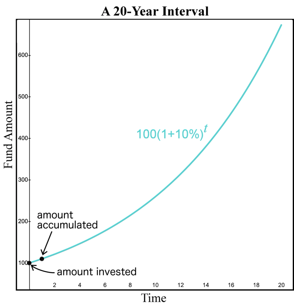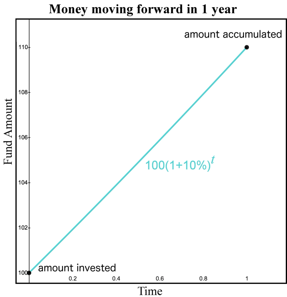If our compound interest rate is 10% and we invest $100 for one year, then after one year, our fund increases to . In the actuarial world, we reserve a special word “equivalent” to represent a key concept. We would say that $100 today is “equivalent” to $110 in one year if our compound interest rate is 10% per year. Notice the word “equivalent” is not the same as “equals.” We’re not saying . We use the word equivalent because if our interest rate is 10%, prudent investors would be equally satisfied with $100 today as they would be with $110 in one year, ignoring all other factors of finance (like whether they need the money more today or in one year). Here is a graph of how this fund grows over time.