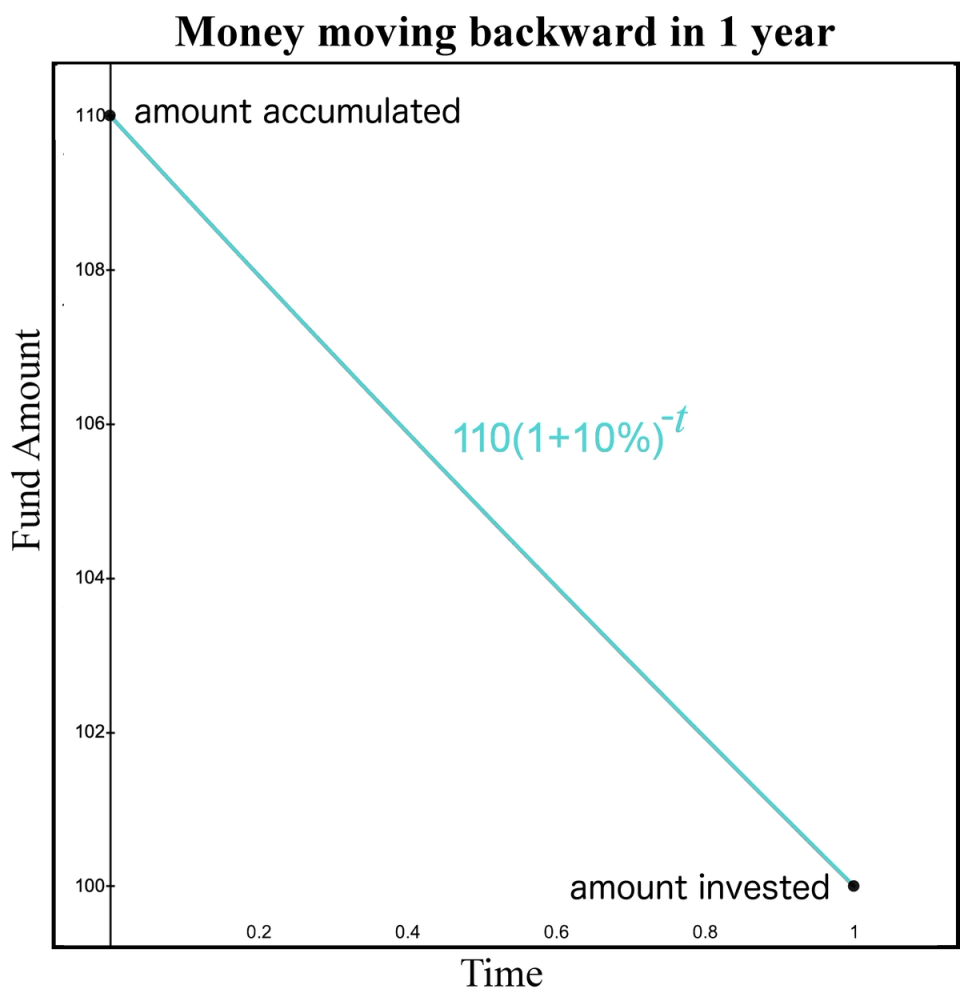 Recall we started by multiplying by the factor to accumulate money forward. Thus, we’ve identified that if we want to accumulate money forward, we multiply by , and if we want to move money backward, we divide by or multiply by . Using the same logic, we can accumulate money forward by dividing by .