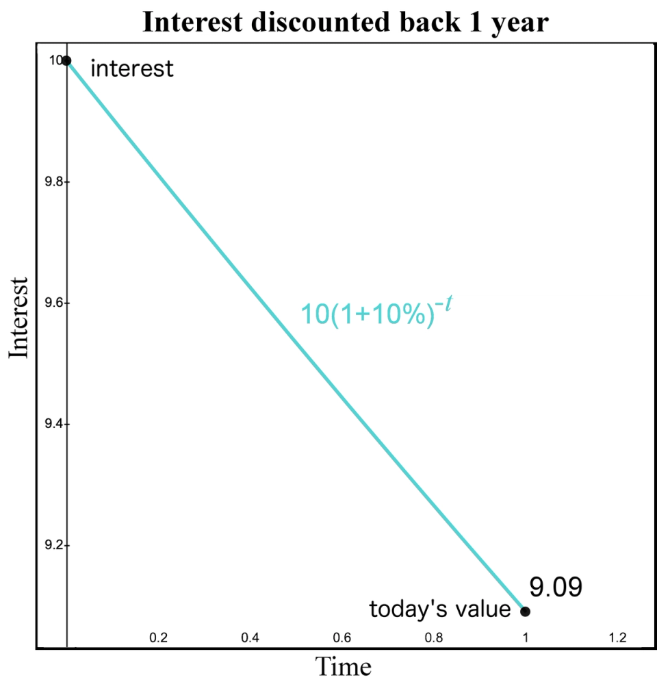 What does this 9.09 represent? Return to our initial story where you invested $100 in the bank and the bank promised to return your $100 principal payment in 1 year and to pay you $10 in interest. Note that this is not the only way the bank could pay you interest.