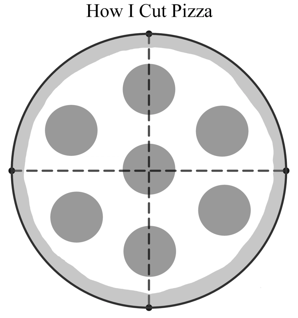 How would you cut the pizza? There are many ways, but the way I usually cut a round pizza is to make cuts through the center. If I want equally sized pieces for all, I’ll make my cuts symmetrical. Let’s start by cutting the pizza into 4 pieces, which only requires two cuts: one north to south and the other east to west. Figure 3 shows how the cuts may appear.
