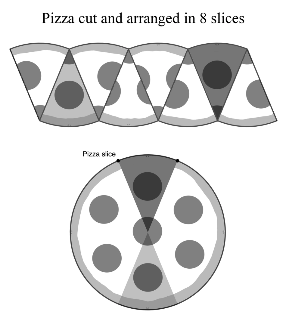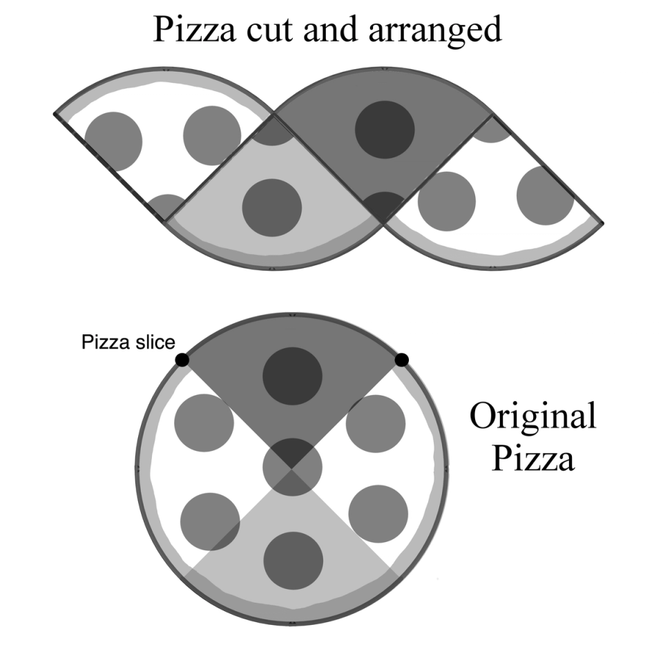 Notice cutting the pizza does not change the area of the pizza. Also, we can move the pieces around however we wish. Moving the cut pieces does not affect the area, only the presentation. Now that the pizza is cut, we are free to arrange the pieces in any order we wish.