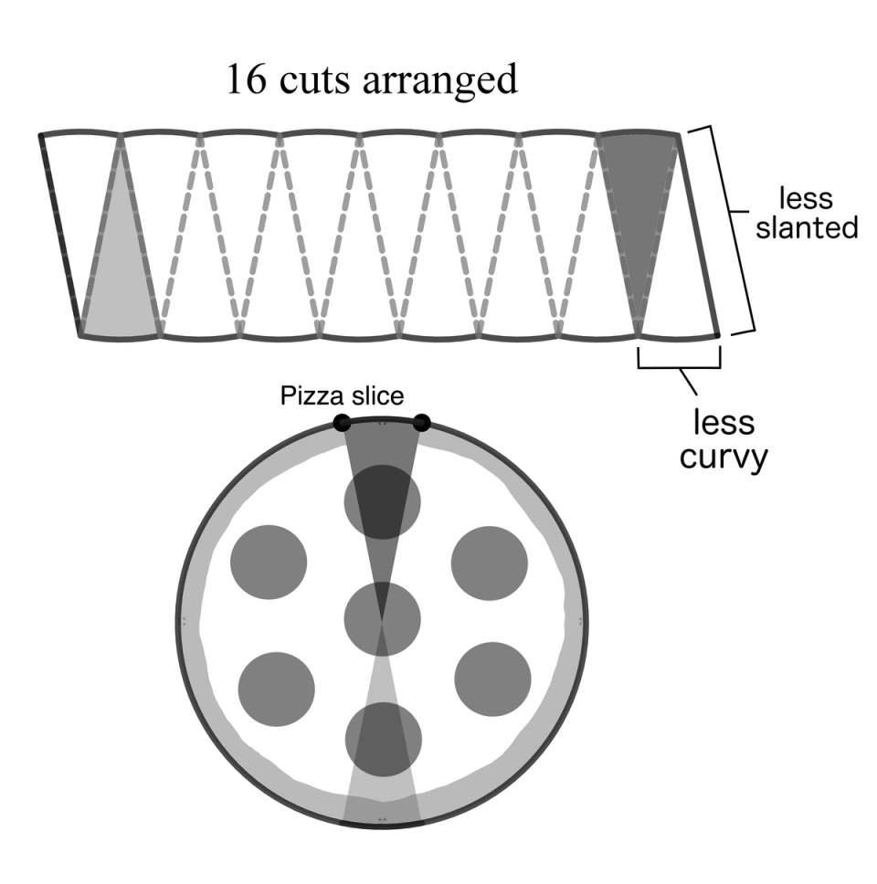 Wow, this looks promising! We have stumbled onto something potentially beautiful, or at least, creative. The curves of the crust are less curvy, so the top and bottom are becoming more like the top and bottom of a rectangle. The sides are straight, which is what we need, but they are slanted. However, they are less slanted than before. We like where this is going, so let’s repeat and make 4 more cuts to double the pieces from 8 to 16 in Figure 6.