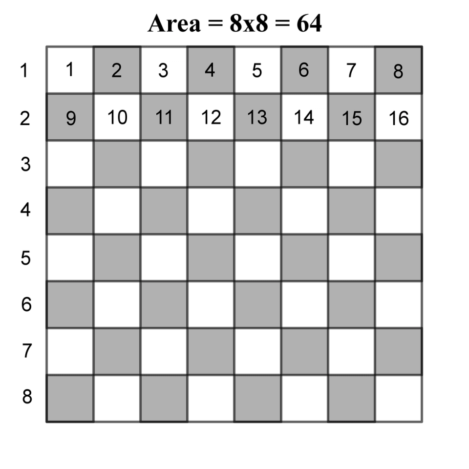 Think of a square as a chessboard as in Figure 1. If we wanted to know the area of the chessboard, we could measure the area of one square of the chessboard and then count the squares. Since we don’t care about units, we can just define the length of a side of one square as 1. Then, the area of one square is . Thus, we can count the number of squares to calculate the area. If we count the number of squares on the top row, we count 8. We move to the second row and, not surprisingly, find there are 8 squares again since the rows line up nicely. Then, we notice we have or 16 squares in the first two rows.