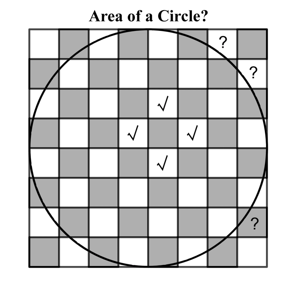 Since our goal is to calculate the area of a circle, clearly, we have a problem. We can count some of the squares that are completely within the circle. But there are many squares that are partially in and partially out. We could try estimating the area of each partial square to arrive at an approximate total, but that seems to go down the path of ugly math, which we try to avoid. Let’s follow another path.