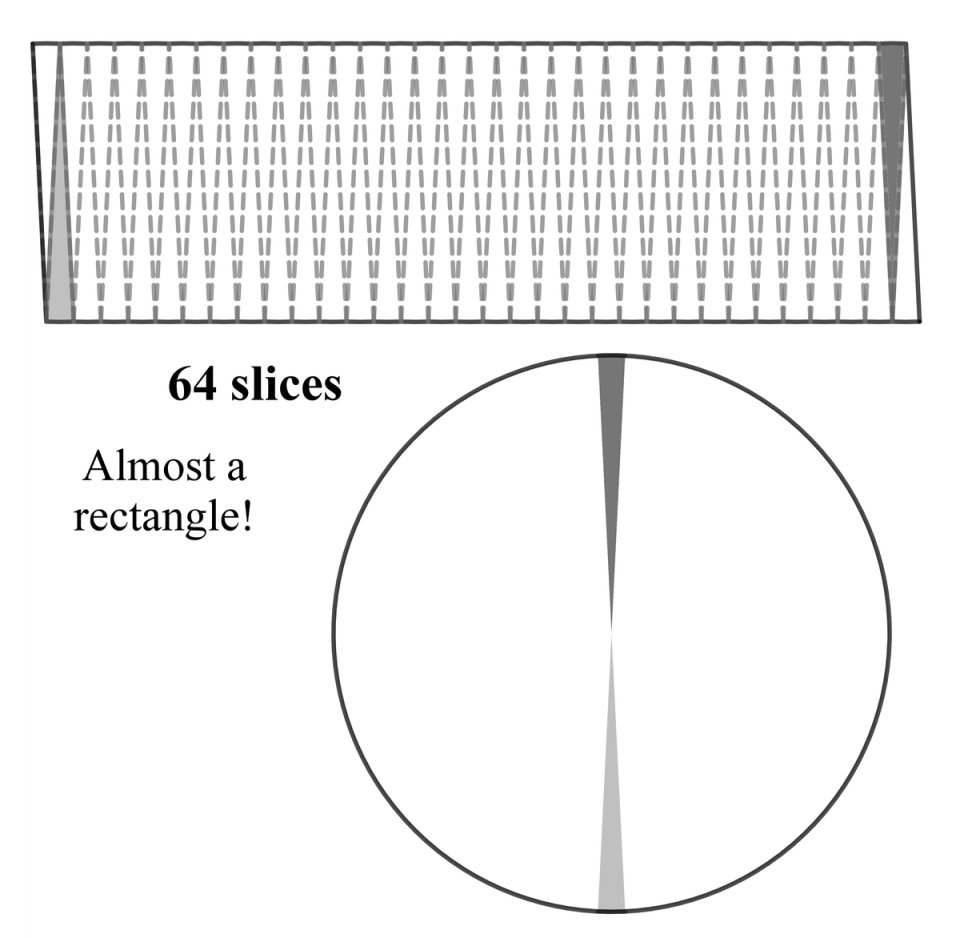 Good. But what is the width of the rectangle? The width is the length of the top or the bottom, whichever we prefer. Again, remember how we cut each slice and how the slices were organized. It may help to return to 4 slices in Figure 9.