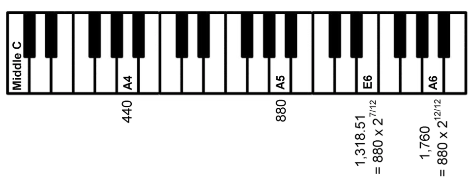We know we double the frequency every octave, or every time we move to the right from an A to the next A. But the key we are searching for must be between the A5 and A6 keys, so we need to know how the frequency changes from key to key within an octave.
