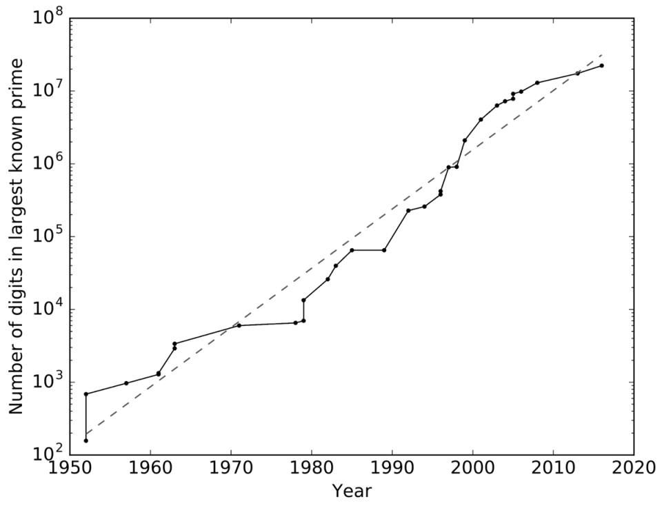Notice the scale of the vertical axis increases by powers of 10. Also notice the graph is close to a line (notice the dotted line). If we draw a graph that is an approximate line on a scale that increases by factors of 10, then we are showing an exponential growth. One reason we use scales that are powers of 10 is to determine whether growth is exponential. This indicates that our hunt for the largest prime is not only alive and well but growing at an exponential rate.