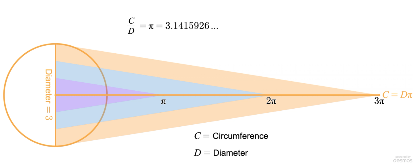 If we return to our previous graph, we can see this linear relationship with circles that have a diameter of 1,2, and 3. Not only do we see that in the line we draw as the circumference, but notice we can create a triangle for each circle.
