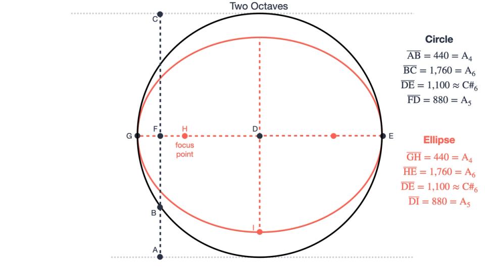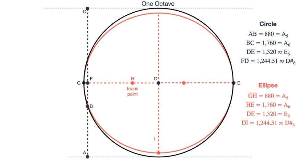Now that we have our ellipse drawn and identified, how can we connect this ellipse to music? Since the distance from point to is 880, we can view this distance as the frequency for . Likewise, the distance from to is 1,760, which is the frequency for .