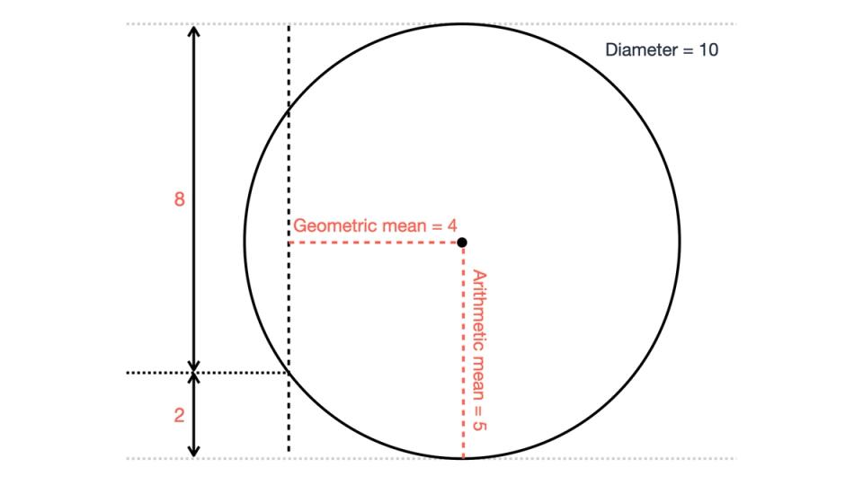 The circle has a radius of 5, which indicates the arithmetic mean is 5. The geometric mean of the circle depends on where we draw a vertical line through the circle. Since we want a geometric mean of 4, travel 4 units to the left of the center. Then, draw a vertical line through that point and plot the points and . We know from our field goal problem that the distance from to is 2 and the distance from to is 8. In summary, both the circle and ellipse illustrate the arithmetic and geometric means for the numbers 2 and 8.