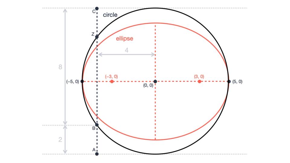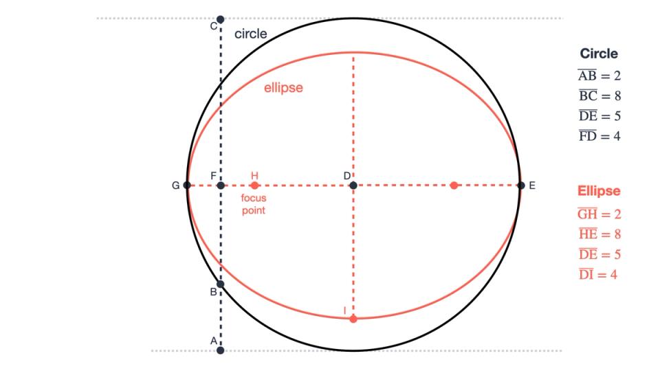 Step 3: Calculate the geometric mean, which is 4. For the circle, the geometric mean is the distance from to . For the ellipse, it is the distance from to .