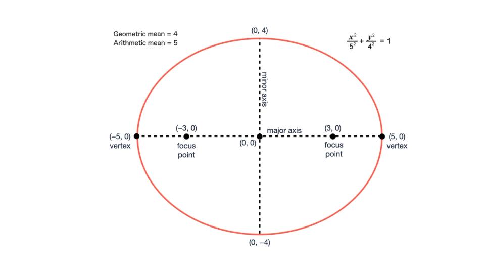 How does an ellipse illustrate the same two means using the same two numbers? The easiest way is to consider an ellipse centered at the origin. Let’s assume the widest part of the ellipse is along the -axis. The widest part of an ellipse is called the major axis, and the narrowest part of an ellipse is called the minor axis. The two points on the ellipse that also lie on the major axis are called the vertices. Thus, the length of the major axis of an ellipse is the distance from one vertex to the other. Since the longer part of the ellipse is along the horizontal, the shorter part of the ellipse is the height. If we have this setup, then the general formula for an ellipse is + = 1, where is the arithmetic mean embedded in the ellipse and is the geometric mean embedded in the ellipse. Since we want an arithmetic mean of 5 and a geometric mean of 4, then we can write the equation for the ellipse as + = 1. In short, we can easily identify the arithmetic and geometric means from the formula of an ellipse.